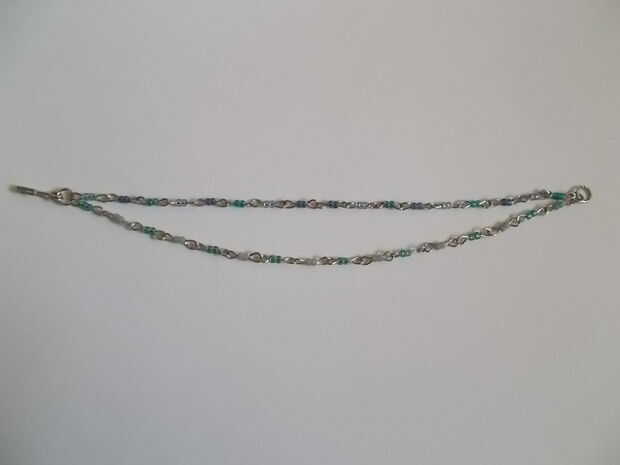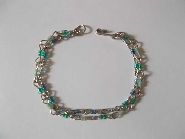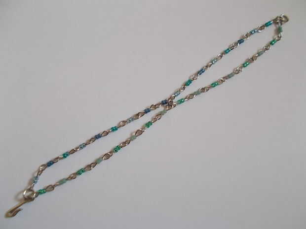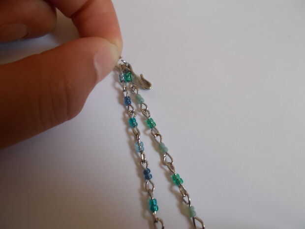 Es simple poner fin a una cadena de eslabones de grano de semilla, pero además podría hacer cadenas más finas de dos (o más) y conectar ambos a los corchetes de la misma. En lugar de simplemente conectarlos, podría trenzar las cadenas antes de añadir enlaces. Incluso podría utilizar compradas cadenas (como en las cadenas de la cadena) y añadir dos, uno a cada lado de los enlaces de cuentas central.