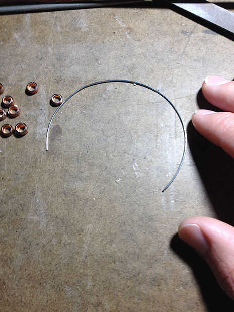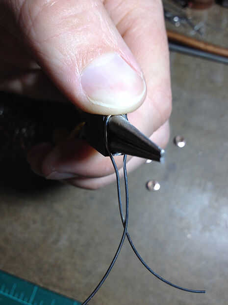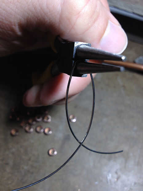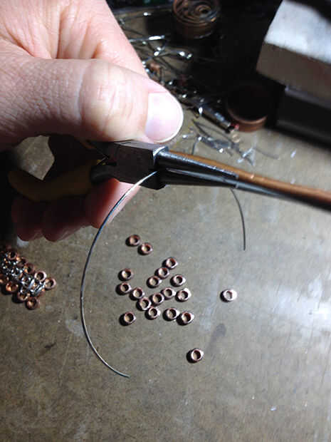 Lo siguiente le mostrará cómo hacer que un segmento de la pulsera de piel de dragón: 3) empieza con una pieza de longitud de aproximadamente en 4 de alambre de cobre. Lugar entre los alicates redondos de la nariz contra la parte posterior. Sujeción del cable en su sitio, doblar ambos lados del alambre hacia abajo. Retire el cable y a la parte exterior de las pinzas. Forma el cable parcialmente en la parte inferior de las pinzas y enderece el cable trasero en ambos lados. Estas instrucciones son un poco tedioso, por lo que traté de incluir una foto para cada paso. Casi hecho, solo un par de pasos más!