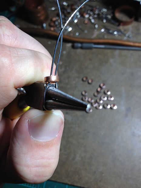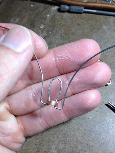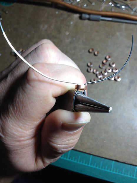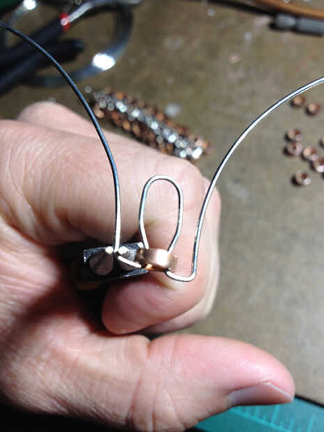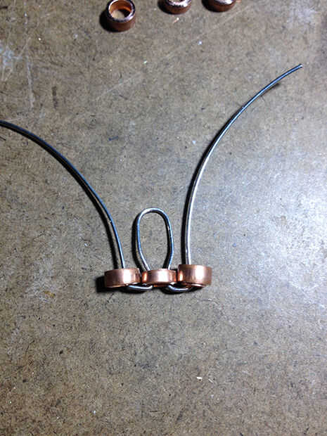 Gire de modo que los extremos del cable son hacia arriba y alimentan de un anillo de cobre. Doblar los extremos del cable 90 grados en direcciones opuestas. Utilizando los alicates de punta redonda, doble los extremos del cable 90 grados hacia arriba así que hay suficiente espacio para que los otros dos anillos cobre deslizarse sobre.
