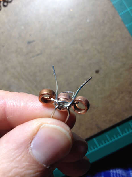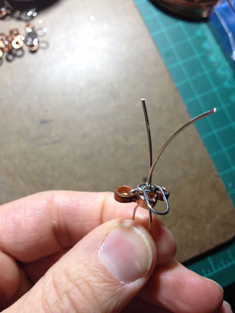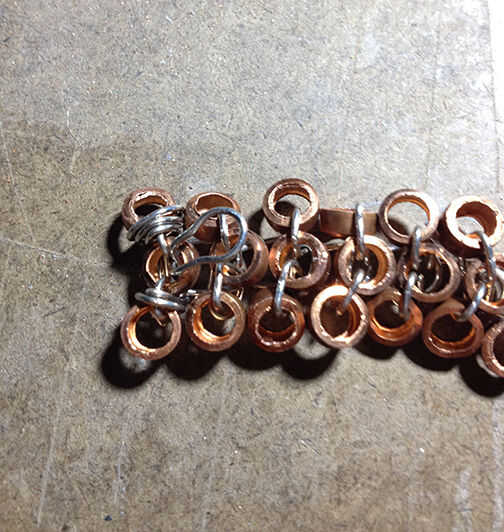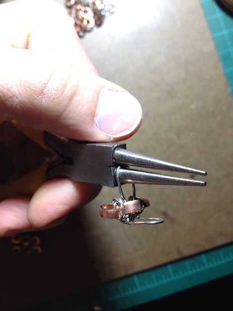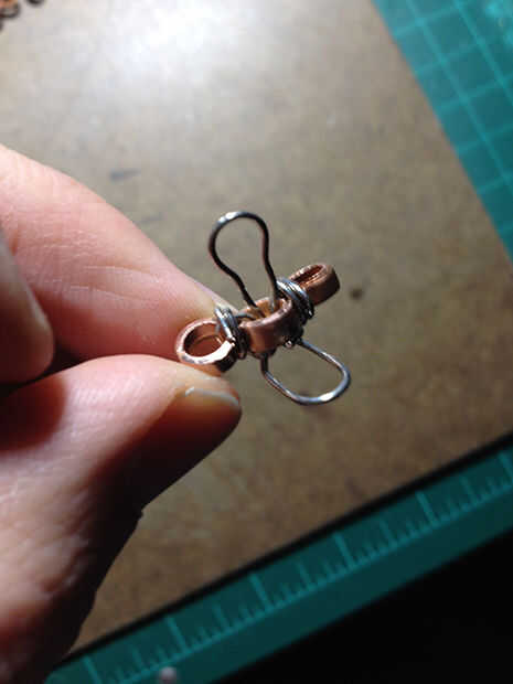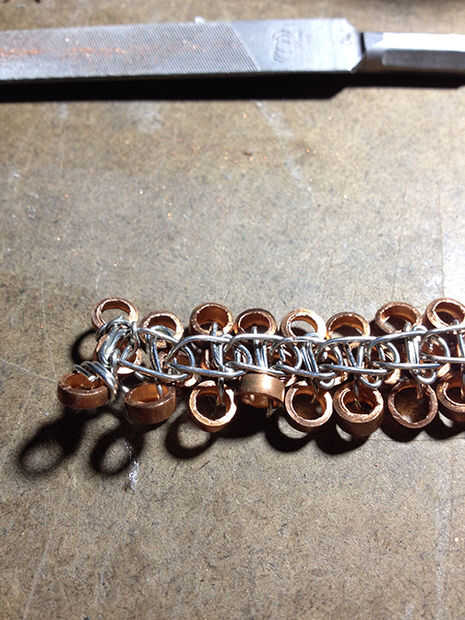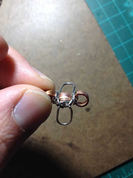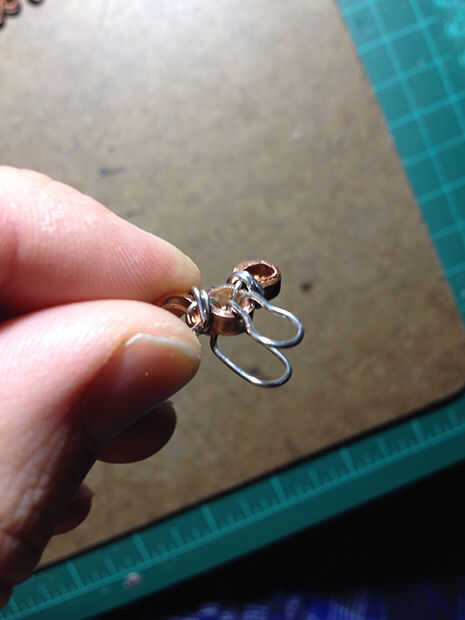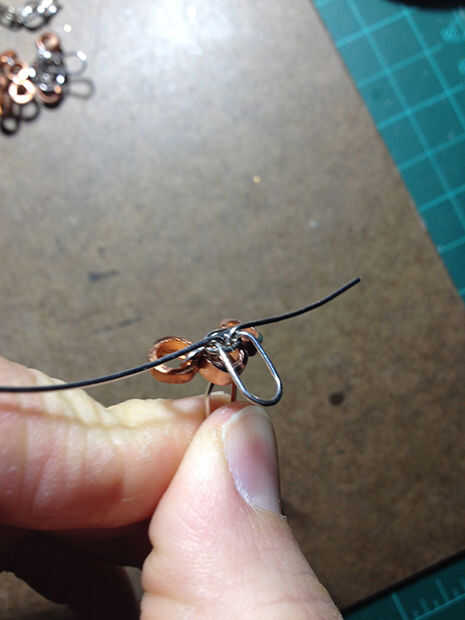 Para este paso, el segmento del extremo de la cola (el primer segmento en la Asamblea) se ha eliminado para mejorar la claridad. Lamentablemente no puede hacerlo porque está bloqueado la cadena, pero no es difícil :) Empezar por crear un bucle (paso tres: segmento de la piel de dragón: primera parte) y alimentación a través del anillo de cobre de centro como se muestra. Doblar los extremos de 90 grados en direcciones opuestas y gire alrededor de las secciones entre los anillos de cobre. Coloque el lazo alrededor de la parte inferior de los alicates redondos de la nariz. Pellizque la base del lazo para crear una forma de la bombilla y el lazo de la curva 90 grados (misma dirección que el primer bucle). Esta forma de la bombilla puede ayudar a mantener la pulsera de desconectar, además de que anuncios un toque agradable a la mirada. Las dos últimas fotos muestran lo que parece esta pieza de la cadena.
