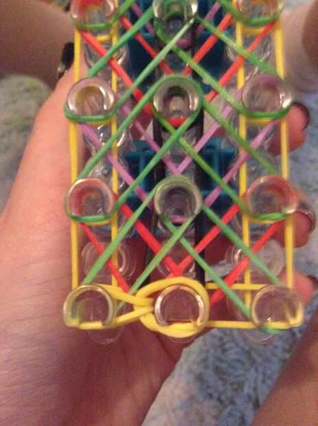 Empezar bucle, pasar por debajo de todas las bandas y tener la franja amarilla superior y colocar a la izquierda. Hacer lo mismo con la banda derecha.