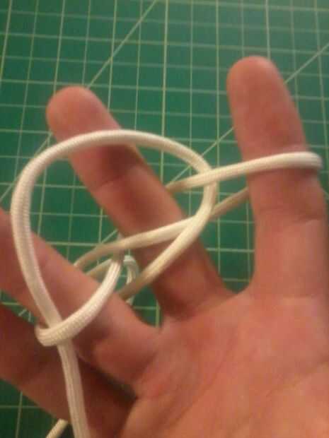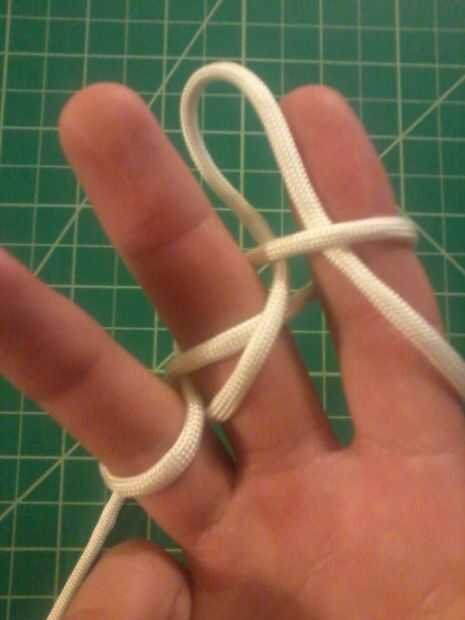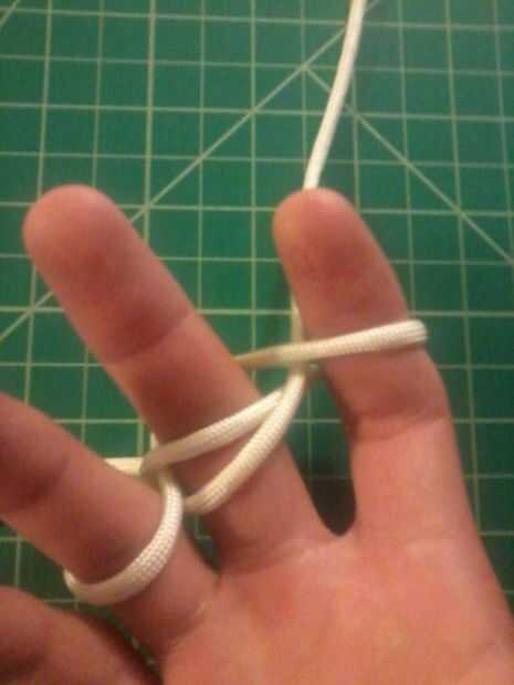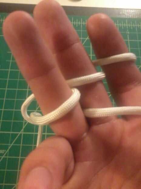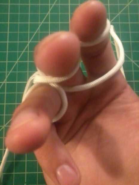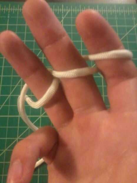 Encontrar el centro de la cuerda y empezar con el dedo índice y abrigo alrededor de la mano que representa la forma en la primera foto. Lazo el extremo que debe estar en ejecución hacia usted por debajo de la cuerda y entre el anillo y el dedo medio. Lazo lo para arriba a través del bucle alrededor del dedo índice luego hacia abajo a través del bucle alrededor del dedo del anillo.