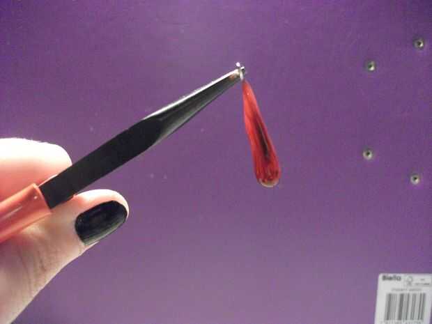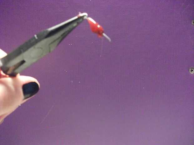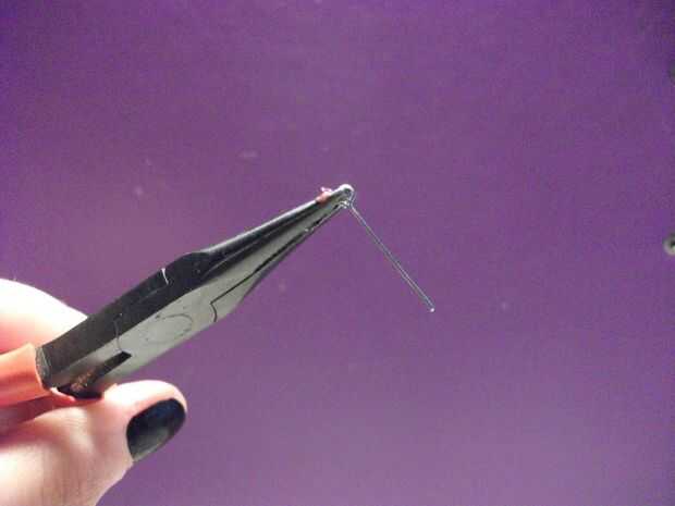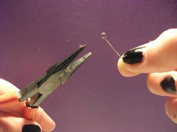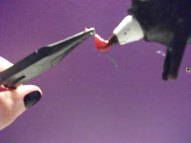 Tome el lazo-perno del ojo del lazo con los alicates. Con mucho cuidado, poner una gota de pegamento en el perno del lazo ojo y deje que se derrita todo a lo largo de la espiga. Puede Agregar poco más de pegamento si crees que no pones suficiente.