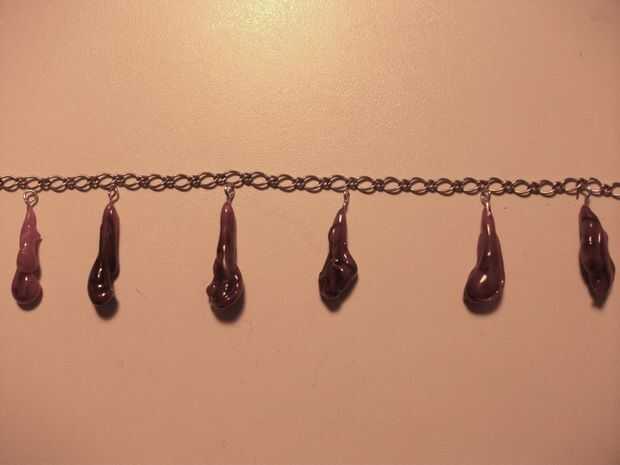 Tomar la cadena y cortar al tamaño deseado. Pensar en el cierre, y luego hacer la cadena más larga. Una vez que has cortado lo, distribuir las lágrimas a lo largo de la cadena.