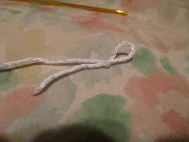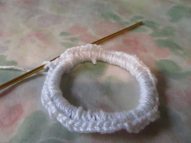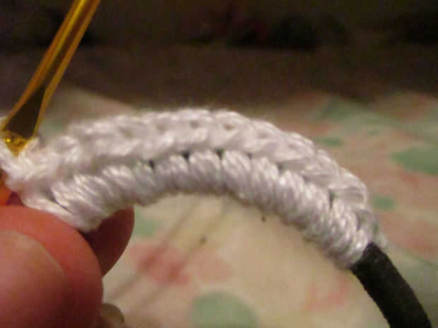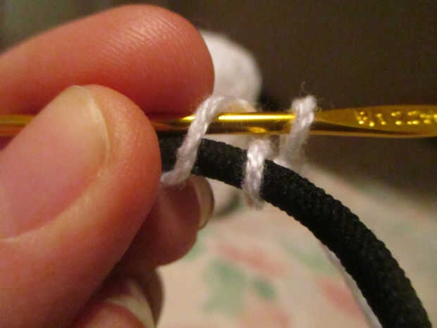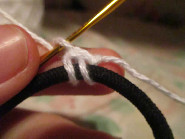 La primera cosa que hacer, es por supuesto, hacer un nudo del resbalón. Poner en el ganchillo, poner el ganchillo de delante del elástico y dibujar un lazo por detrás. Tiran otro lazo a través. Sólo están haciendo un solo ganchillo puntada en la parte superior el cabello elástico. Punto bajo de la misma manera todo el cabello elástico. Asegúrese de que empuja las puntadas bien y juntos!