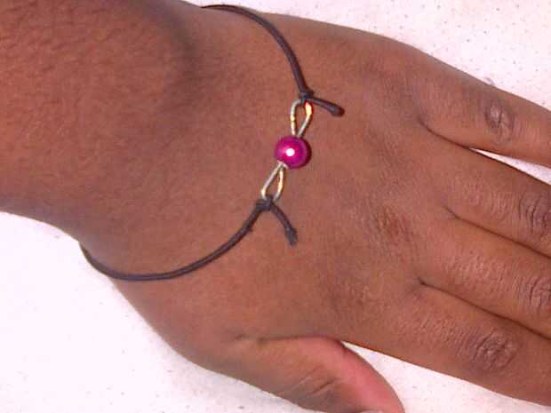 Usé un poco de elástico y atado un nudo a cada lado de las asas para que sea una pulsera. Puede usar una cadena como la pulsera principal y utiliza dos anillas a cada lado de los lazos en su lugar o utilizar la cadena como un accessory(customize) para su nueva pulsera. :)