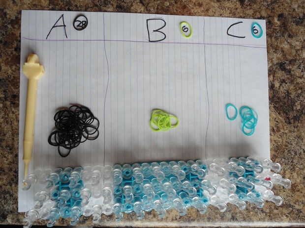 Realizar esta pulsera necesitarás: 28 "A" (negro) colores bandas, 6 "B" (verde) color bandas, 6 "C" bandas coloreadas (azul), un telar del arco iris con el gancho y un clip de c