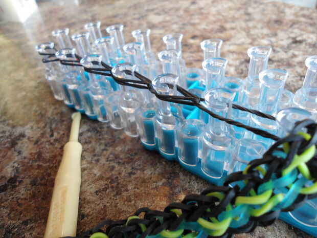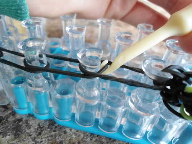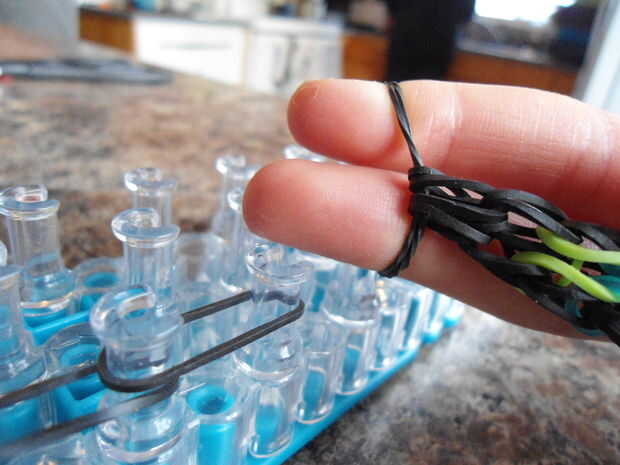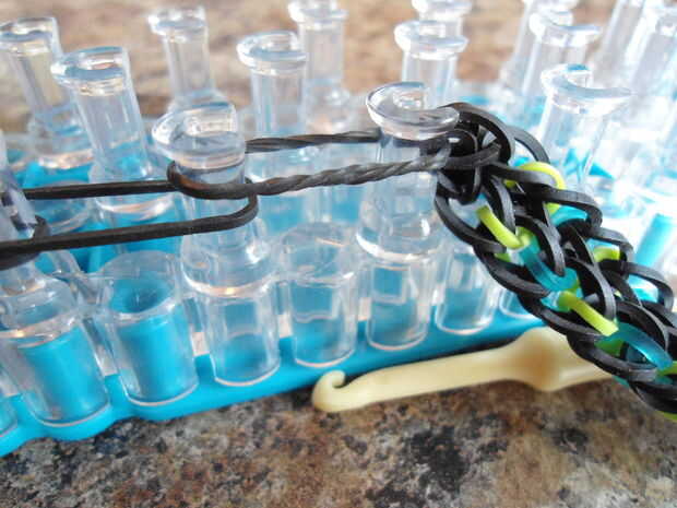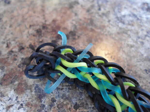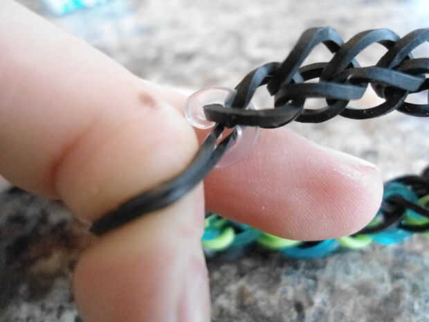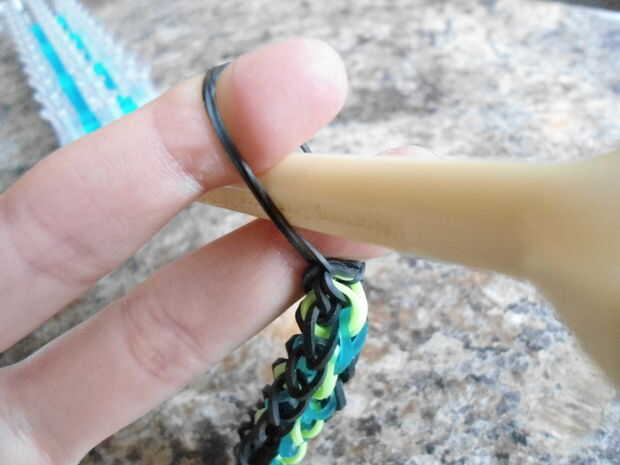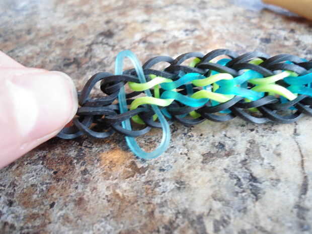 Una vez que han tirado la pulsera, te darás cuenta que hay una banda floja, usted puede simplemente cortar que. Esta pulsera no es lo suficientemente grande como para caber una muñeca pero necesitamos ampliarlo. Extenderlo, la flecha roja apuntando lejos de usted y colocar unos 5 o 6 "A" color bandas en forma de cadena simple. Luego ubicar la banda de la tapa en su pulsera y estirar sobre la última banda y uno detrás de él. Ahora usted puede hacer la única cadena de bucle hasta el final. Al llegar al final, se extienden esa banda sobre el pasador central. Ahora puede adjuntar un clip de C a la banda externa. Una vez que todo esto se hace, se puede lograr la extensión. Para terminar la pulsera, Deslice dos dedos en la banda que se une al gancho y tire el anzuelo, luego simplemente coloque el clip en c a la banda en los dedos. Finalmente termine ahora!