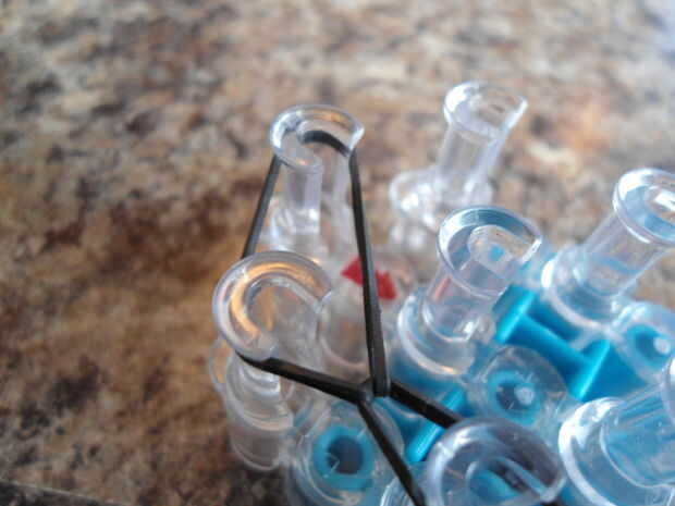 he modificado este video tutorial para crear una pulsera bigote! ¡ Disfrute!Paso 1: Se necesita: una tira de las clavijas de un telar del arco iris, dos colores de bandas (mina son de color rojo para las bandas de encuadre y plata para las bandas de
