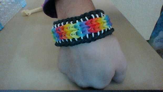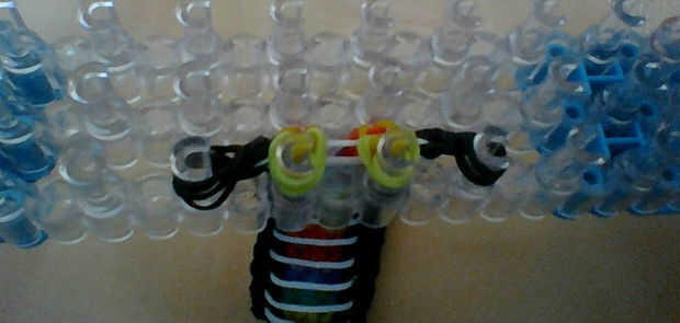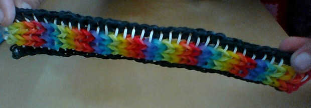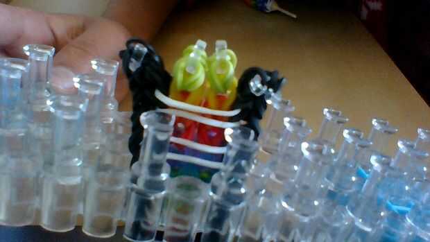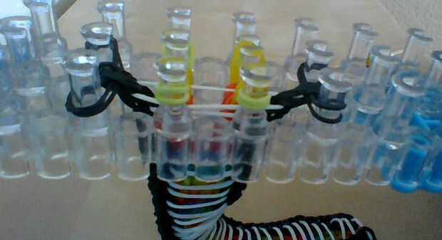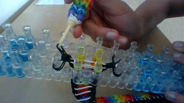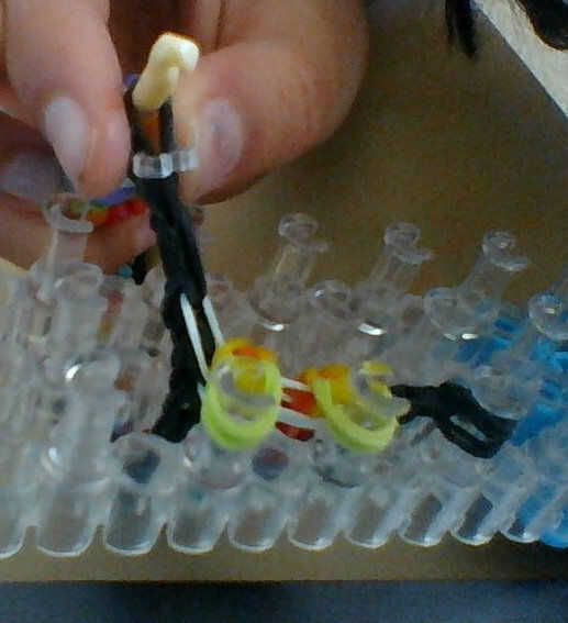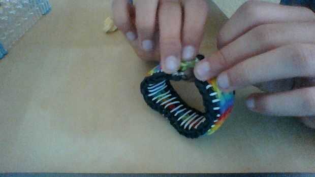Ahora pega el gancho a través de las cuatro bandas en la primera clavija y coloque un clip C o S. Hacer esto a todos cuatro clavijas. Ahora con cuidado tire su pulsera de telar y coloque los cuatro clips de S o C al otro lado. Ahora ya tienes tu pulsera.