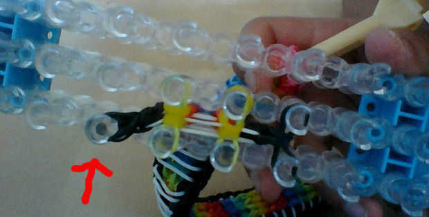 Si tienes 1,2 o 3 rayas en su telar voltearlas siguiendo el patrón del paso 8. Ahora no tienes las telas a rayas. Luego coge sus dos bandas de la segunda clavija (el uno que está detrás de la más cercana a usted) en la primera fila y colóquela en la primera clavija. Hacer esto para todas las filas.