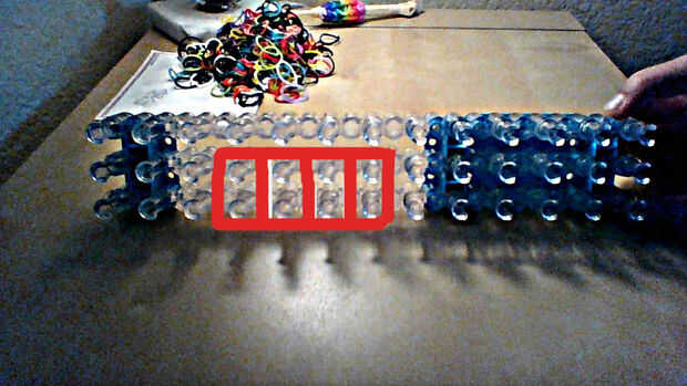 he modificado este video tutorial para crear una pulsera bigote! ¡ Disfrute!Paso 1: Se necesita: una tira de las clavijas de un telar del arco iris, dos colores de bandas (mina son de color rojo para las bandas de encuadre y plata para las bandas de