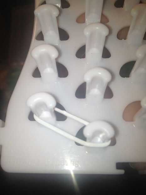 Asegurándose que las clavijas se enfrentan hacia abajo, coloque su primera banda de goma en el telar.
