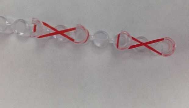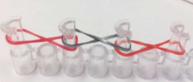 Colocar una banda de plata en el mismo patrón de ocho entre la segunda y tercera clavija, tendiendo un puente entre las dos clavijas rojo. Ahora debería tener un lazo rojo en la primera clavija, rojo y plata en la segunda clavija peg, rojo y plata de la tercera clavija y un lazo rojo en la clavija de cuarta (ver figura). Estas son las bandas solas que se torció en figura de ocho. El resto simplemente se se extendía entre las clavijas sin torceduras.