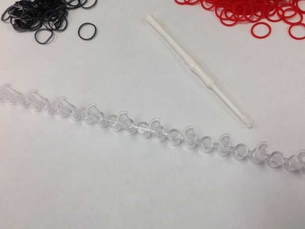 Coloque una banda roja entre la primera y segunda clavija y otro entre la tercera y cuarta peg. Debe tener dos lazos rojos en la primera clavija, dos rojos y una de plata en la segunda clavija, dos rojos y una de plata en la tercera clavija y dos lazos rojos en el cuarto peg (ver imagen).