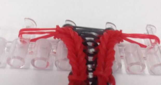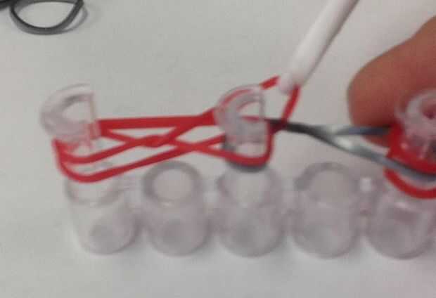 Ahora coloque una banda roja sobre el primero y segundo las clavijas y otro sobre las clavijas terceros y cuarta. Esto hará tres lazos en los cuatro de las clavijas.