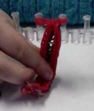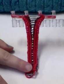 Coloque el gancho a través de todos los lazos sobre peg dos. Use el gancho para agarrar a una banda nueva y tire de ella a través de los lazos de la clavija (ver imagen). Asegúrese de que sostener el otro extremo de la banda hasta que puede enhebrar el garfio por ambos extremos, con todos los lazos de la segunda clavija en el centro de la nueva banda. Otra banda a través de los extremos de la primera banda del gancho y seguir esto hasta que tenga una cadena de bandas solo lo suficiente para completar el círculo alrededor de la muñeca (ver imagen).