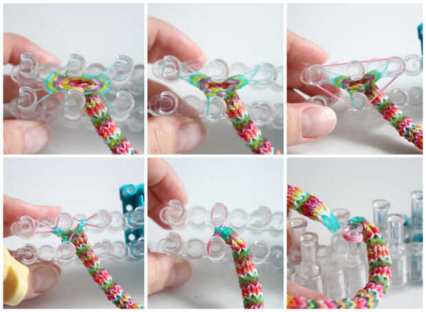 Condensar las bandas para tres clavijas, añadir una banda alrededor de ellos y traer a las bandas de abajo. Poner todas las bandas en una clavija y conectar al otro extremo de la pulsera con el C clip.