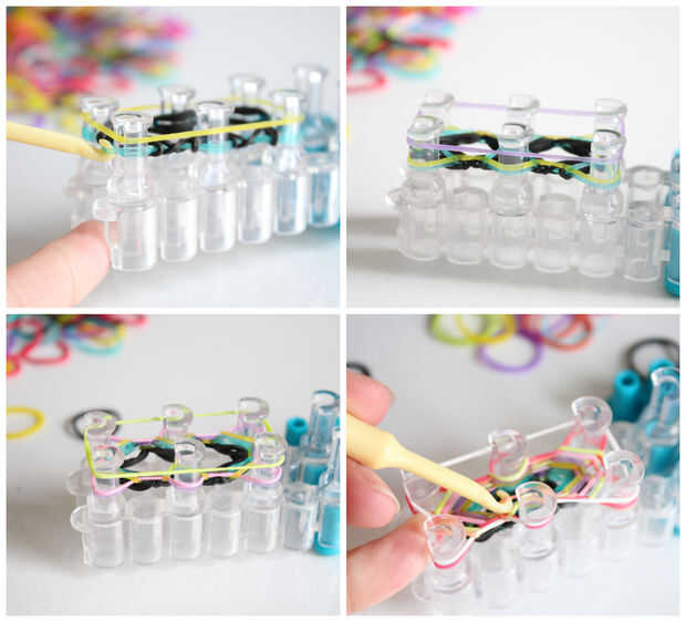 Para cada capa, añadir una nueva banda alrededor de los seis clavijas y luego tomar la banda de fondo y estirarlo hacia arriba y sobre las dos bandas superiores en cada clavija. Agregar otra banda alrededor de los seis clavijas y repita el proceso.