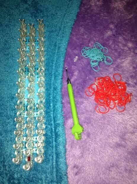 En primer lugar, tenemos las fuentes para la pulsera.Usted necesitará lo siguiente:Un telar, un gancho que se avecina, un montón de bandas y un clip de c, s u o.Paso 1: Poner las bandas en el telar Tomar dos bandas de telar y ponerlos juntos en la mi