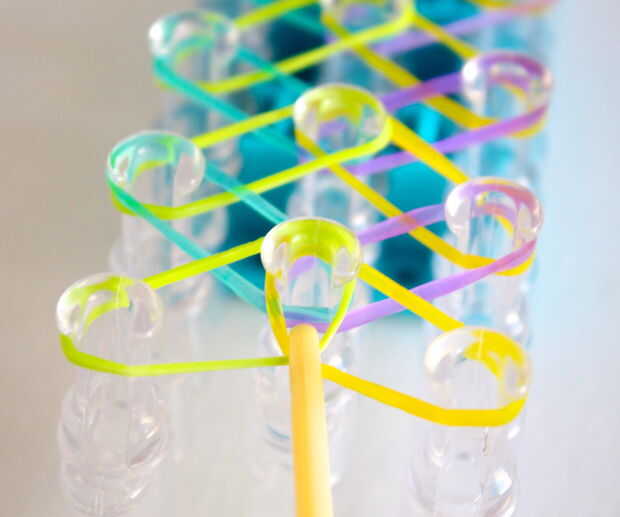 - Para completar este conjunto de lazos, agarra la banda verde en la segunda clavija izquierda y lazo en el centro.