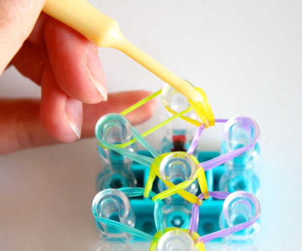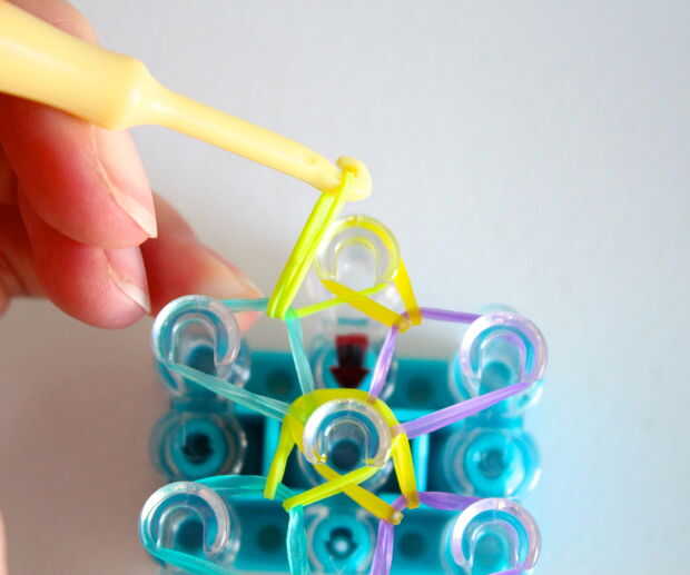 * punta si esta es su primera vez haciendo e intermedio nivel pulsera sugiero usar los mismos colores.Primero consigues una banda de caucho (verde) va en la clavija media y poner diagonalmente hacia arriba a la izquierda y luego de la misma a la dere