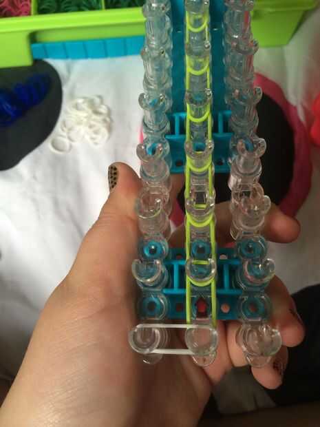 Poner bandas de goma blancas y azules hasta el telar como una sola cadena. Ignorar las bandas de goma verdes durante un minuto.