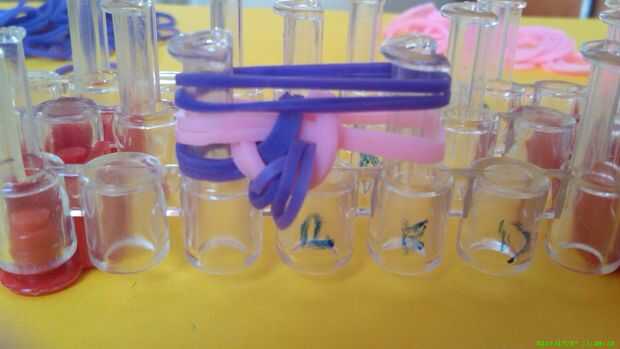 Esta pulsera de telar de la Cruz doble es bastante fácil. Si eres capaz de hacer una espina de pescado, probablemente puede hacer esta cruz telar pulsera sin problema. Lo hice con dos bandas de goma de color, morados y blanco, decorada con algunas fl