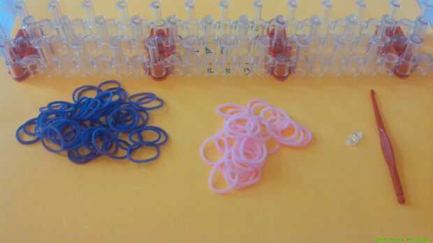 En primer lugar, tenemos las fuentes para la pulsera.Usted necesitará lo siguiente:Un telar, un gancho que se avecina, un montón de bandas y un clip de c, s u o.Paso 1: Poner las bandas en el telar Tomar dos bandas de telar y ponerlos juntos en la mi