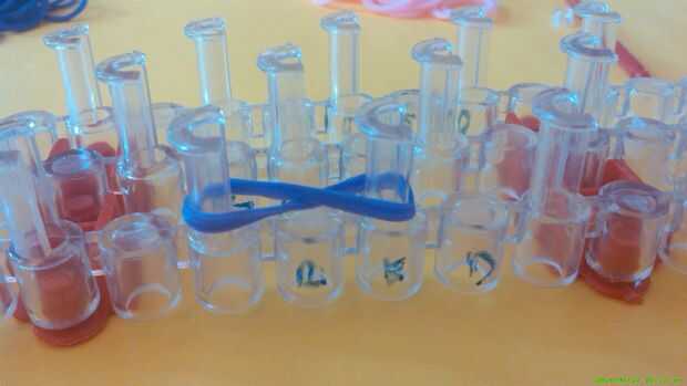 En primer lugar, tenemos las fuentes para la pulsera.Usted necesitará lo siguiente:Un telar, un gancho que se avecina, un montón de bandas y un clip de c, s u o.Paso 1: Poner las bandas en el telar Tomar dos bandas de telar y ponerlos juntos en la mi