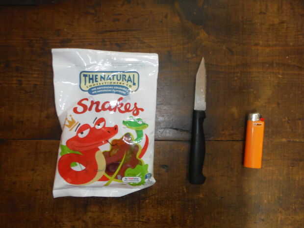 - Una bolsa de caramelos de la serpiente. Aquí, he usado marca 'Confiteria Natural', pero puede usar Pams, Allens, o lo que es barato. Mirando hacia atrás, encontré las serpientes Confiteria Natural no estaban absolutamente como me hubiera gustado y también bastante pegajoso! Tienen sabores absolutamente deliciosos, aunque.