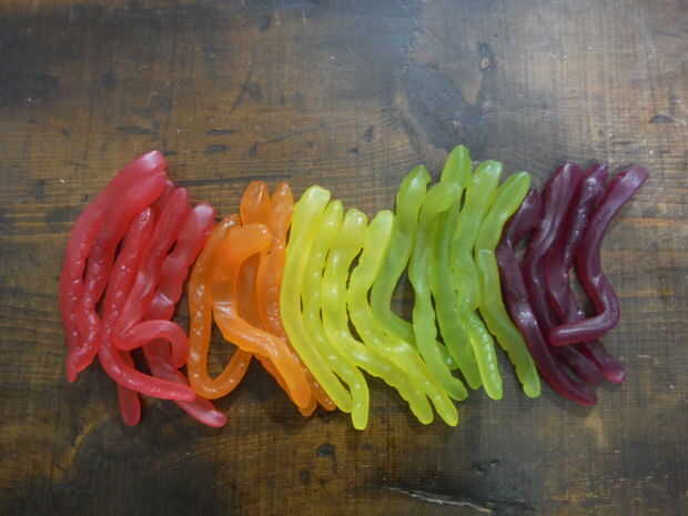 Abre su bolsa de caramelos y ordenar tus serpientes en orden color! Hice mía en un patrón de arco iris, pero usted puede hacer suya sin embargo te gusta. Necesitarás al menos tres de cada color, así que asegúrese de que hay suficiente. Puede algunos extras, para estar en el lado seguro - algunos de mis quince original tiene un poco pegajosas y tuve que comer!