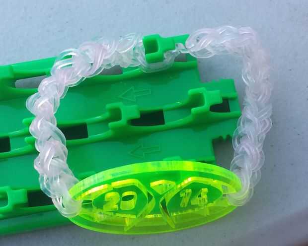 Repita el último paso en el otro lado para crear al otro lado de la pulsera. Gancho la s-de la primera cara a los últimos lazos en el otro lado. Puede que tenga que sacar la pulsera para conseguir el fin a alcanzar, pero asegúrese de que los lazos del pasado no caigan!
