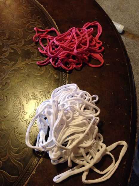 Para esta pulsera hemos utilizado 15 bucles de algodón en dos colores diferentes.