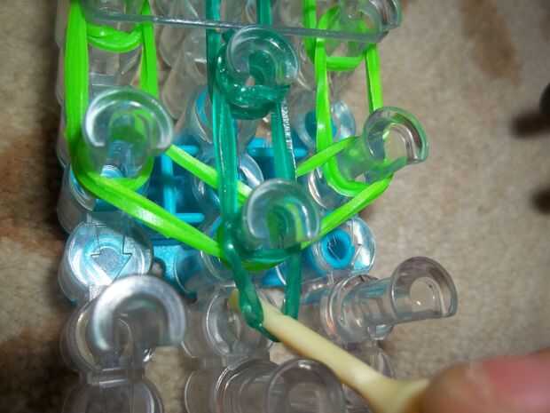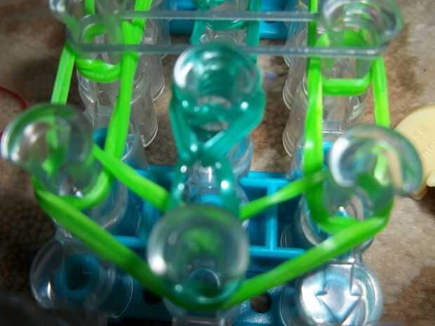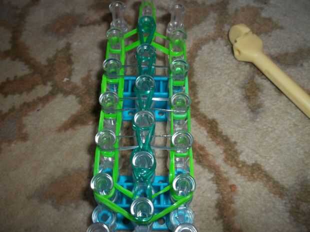 Tire hacia atrás la banda de la tapa con su gancho y lazo de la primera (2) bandas verdes oscuras hacia adelante. Tire hacia atrás la banda de la tapa cada vez y continuar hasta el telar hasta el final.