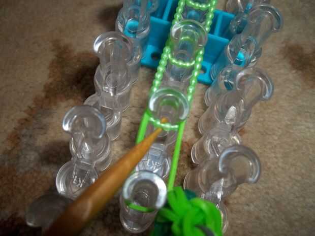 Voltee el telar y empieza a lazo hacia adelante. Complete hasta la última banda. Tomar las bandas del telar. Coloque un clip c o un clip en el extremo de la cáscara y conectarlo al otro lado de la cáscara.