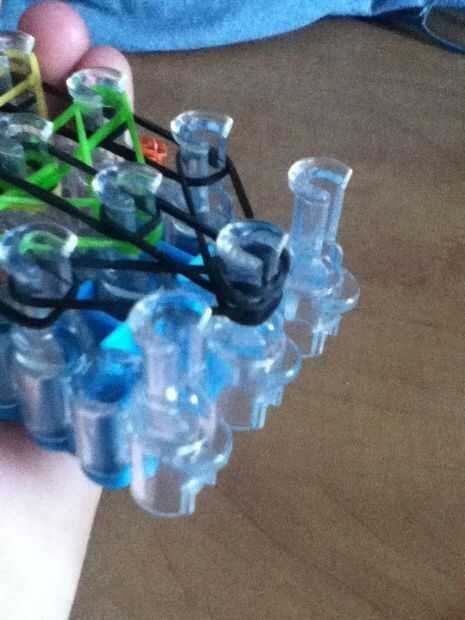 Paso 1: materiales Gancho clip C bandas de goma de telar del telar del arco irisPaso 2: colocar Hacer las clavijas en un gran rectángulo también Asegúrese de que la flecha es hacia usted que colocar una banda de goma del centro a la izquierda y luego