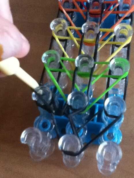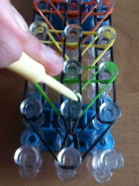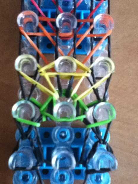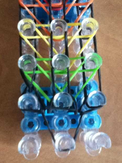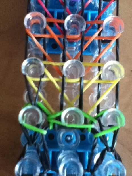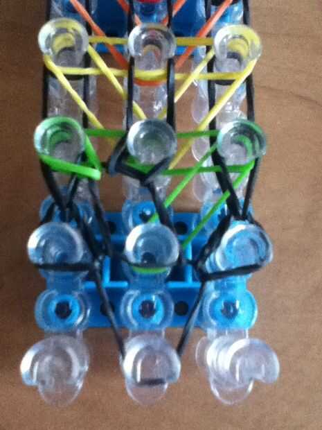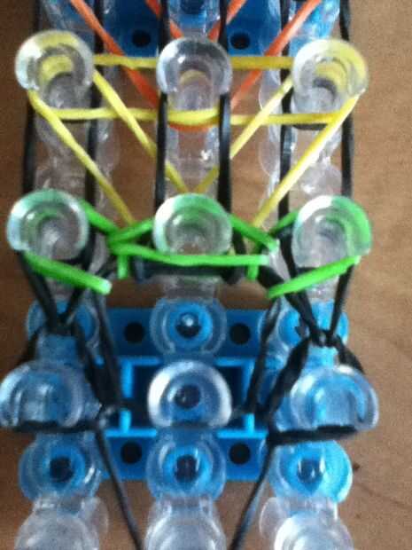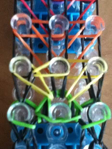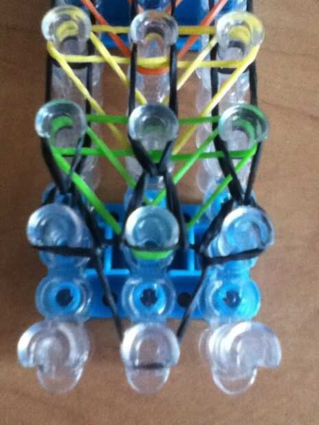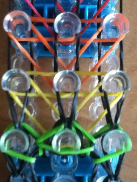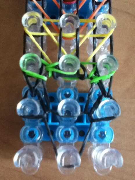 A continuación para los triángulos del lazo, agarrar la banda perímetro negro de la izquierda (entre la segunda y tercera clavija de la izquierda) y bucle hasta la tercera clavija de la izquierda. Ir y agarrar la banda perimetral derecha (entre la segunda y la tercera clavija a la derecha) y lazo en la tercera clavija de la derecha. Entonces la banda negra mediana (entre la segunda y la tercera clavija en el medio) y lazo delantero. A continuación, obtener la banda verde entre la segunda clavija en el medio y la tercera clavija de la izquierda y enganchar a la tercera clavija de la izquierda. Luego tomar la banda verde entre la segunda clavija en el medio y la tercera clavija de la derecha y gancho en la tercera clavija de la derecha. A continuación, tome la banda verde entre la tercera clavija de la izquierda y la tercera clavija en el centro y lazo en la tercera clavija en el medio. Tome la banda elástica verde entre la tercera clavija en el medio y la tercera clavija de la derecha y conectarlo a la clavija de tercera en el centro. Repetir este proceso para los otros 9 triángulos.