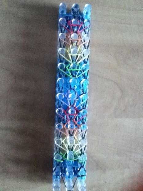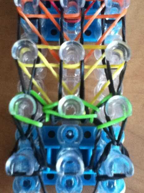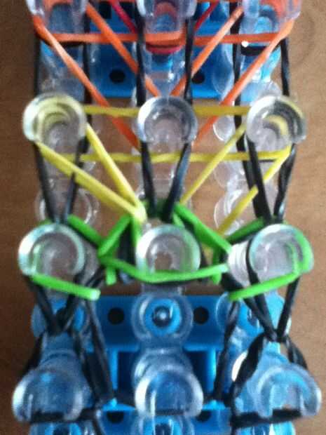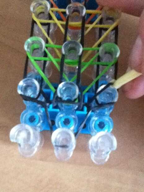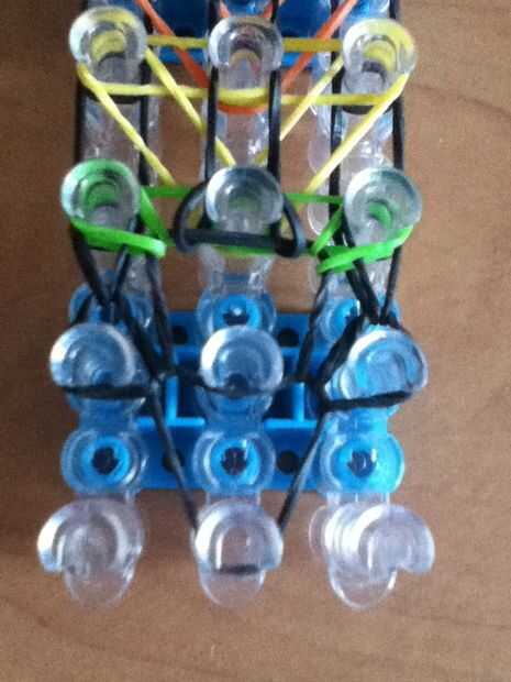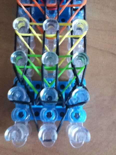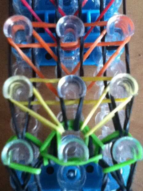 Cuando haya terminado enganchando los triángulos, tomar la banda de goma negra entre la segunda a la última clavija a la derecha y la última clavija en el centro y lazo en la última clavija en el medio. Tomar la cinta de goma negra entre la segunda a la última clavija de la izquierda y la última clavija en el centro y lazo en la última clavija en el medio. Por último, tomar la cinta de goma negra entre el segundo a último peg en el medio y el último y bucle hasta la última clavija en el medio.