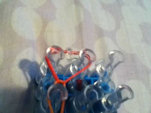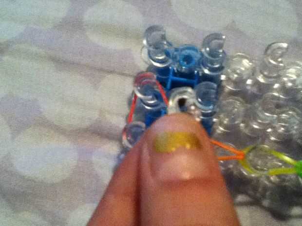 Para colocar el clip en C, estire la banda de goma roja en la primera clavija media y obtener el clip en C. Poner en esta parte se extendía y tire de la extensión y la pulsera de telar. Encontrar el negro tapado banda del extremo de la pulsera y engánchelo en el clip en C para completar tu pulsera.
