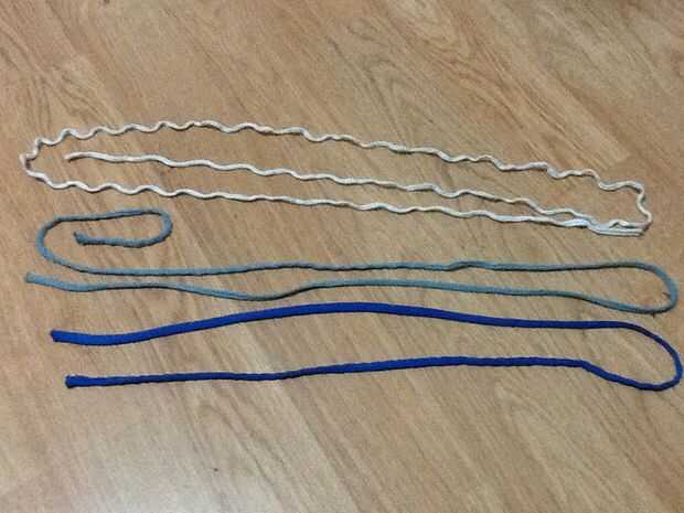 Se necesita 3 hilos de todo lo que desea utilizar: hilado abultado, hilado de la camiseta, escarpa tiras de tela, cuero, etc.. Una tira tendrá que ser más largo que los otros dos. El blanco es mi filamento más largo aquí.