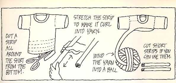 Hice la tela tiras de camisetas viejas. Cortado el dobladillo de la camisa, luego cortar tiras de 1 pulgada o más pequeña de la parte inferior de la camisa. Que corte los lados de las tiras porque la camisa es un tubo continuo. Tiré de las tiras para que queden como hilo. Esta fotografía muestra cómo se hace (https://chawedrosin.wordpress.com/2008/06/23/rugs-...