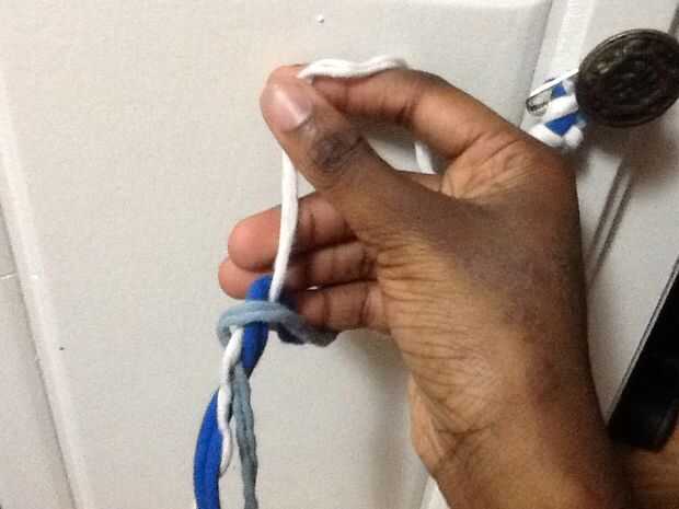 Paso 1: fuentes de Se necesita:Como muchos colores todos iguales y cadena que desee.CintaTijerasY una superficie sólida y plana.Paso 2: Cómo empezar Todas las cadenas atar juntos en la parte superior y luego la cinta hacia la superficie plana. Luego