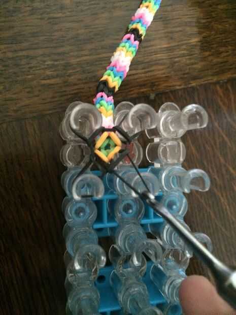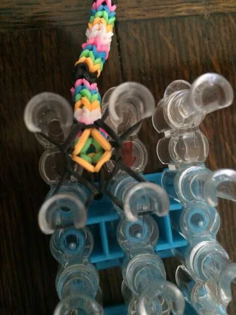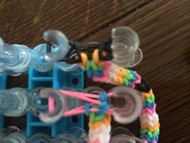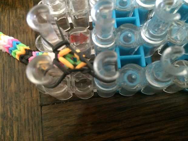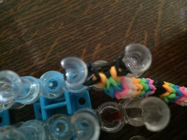 Ahora veamos el otro extremo, debe haber cuatro bucles de la banda "cap", separados en dos grupos de dos y uno situado en una de las clavijas que sólo ha desocupado la banda final, hacer lo mismo con el otro conjunto en la otra clavija desocupada por lo que parece la última foto.