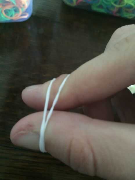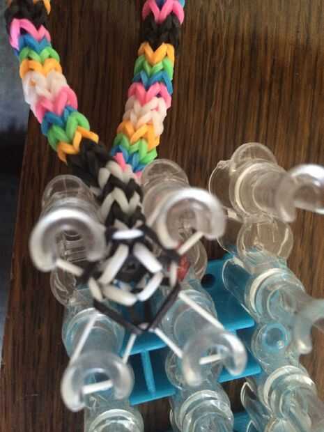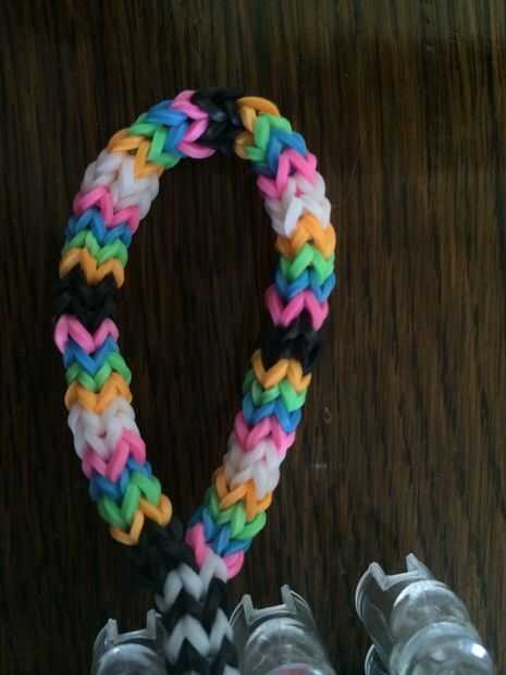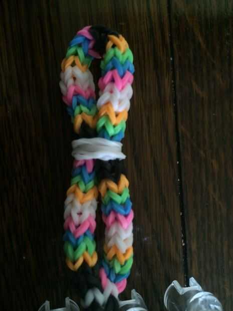 ahora el bucle (el signo del infinito) es claro del telar lo puedes hacer en un signo de infinito, para ello: apoderarse de una banda de cualquier ti doble color en los dedos y deslícela hacia el medio del circulo, repita este paso para que tengas dos duplicado en bandas para hacer el signo de infinito! Ahora continúe con "cultivo" de la pulsera como antes.