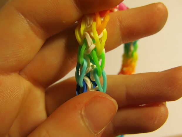 Este es un patrón bastante simple telar del arco iris, pero todos los tutoriales que encontré en línea necesitan un telar o un arreglo complejo de lápices. Se me ocurrió con este método que se puede hacer con sólo sus manos y un gancho o un lápiz si
