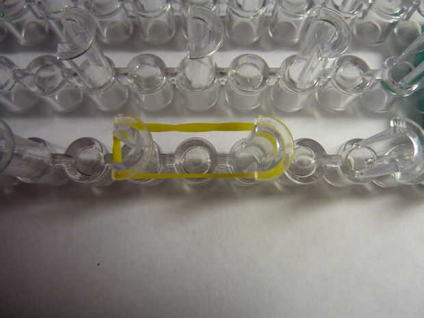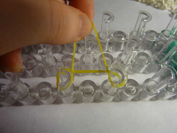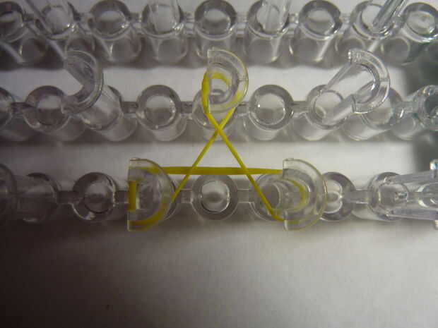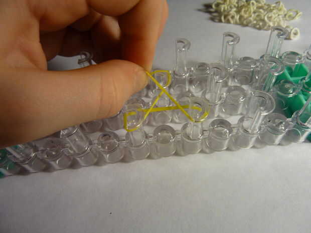 La banda se extienden entre 2 de los palos en el telar (foto1). Luego tomar el lado de que la banda más cercana a usted y tire de él en el otro lado hacia el opuesto antes de palillo (foto2) que enganche la banda alrededor de la palanca, torcerlo (cuadro 3). La banda debe quedar como la foto 4.