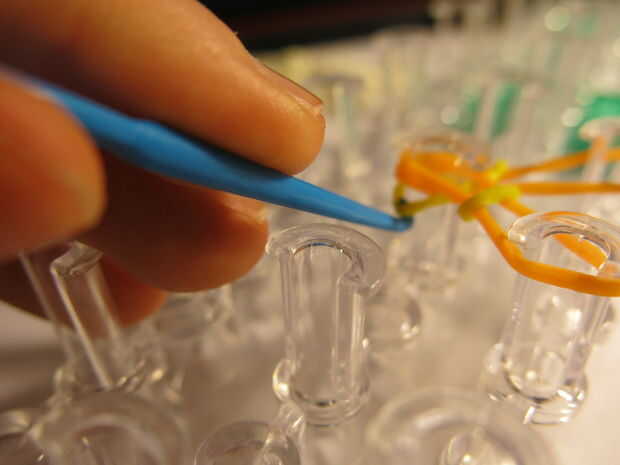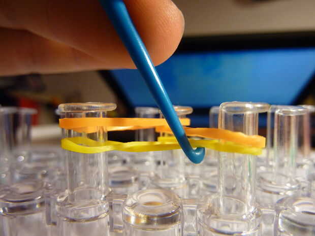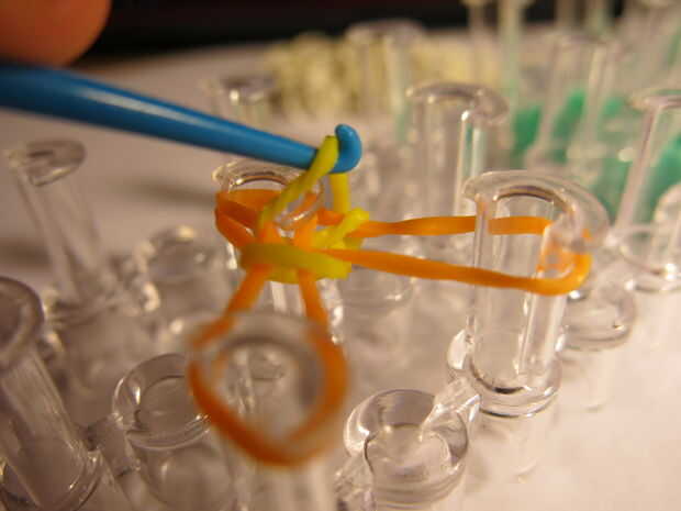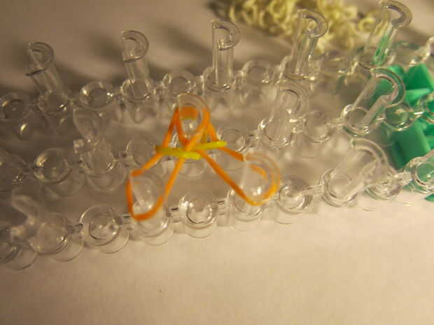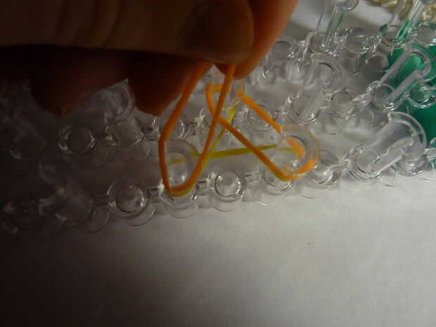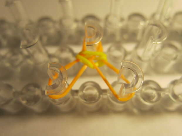 2. Tome su gancho y en el palo derecho de fondo, tomar la banda (amarilla) debajo (Foto 2), sobre los enfermos y liberación (cuadro 3). Ahora repita el stick izquierdo de la parte inferior. Ahora debería verse como cuadro 4.