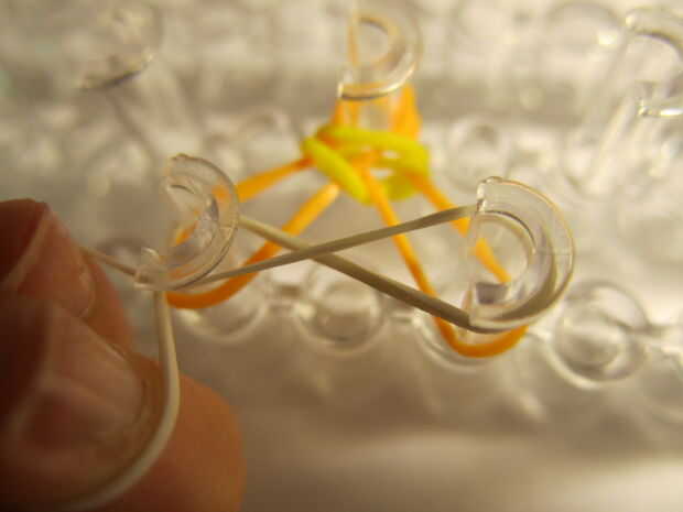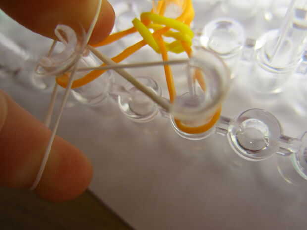 2. en el palo izquierdo de abajo, tomar el blanco y gírelo otra vez, entonces hacia fuera el giro adicional en el mismo palillo. (Foto 2)