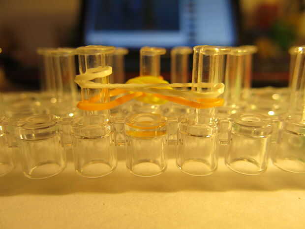 3. ahora en el palo izquierdo de fondo debe haber 1 fuera de banda de color (naranja) y uno en banda de color (blanco. En la parte inferior izquierda stick debe haber 1 fuera de banda de color (naranja) y 2 dentro de bandas de color (blanco). (Imagen 3)
